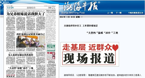 2014年3月10日,《渤海早报》报道了五公司天津碧桂园项目夫妻结伴异乡打工的情况,文章如下: