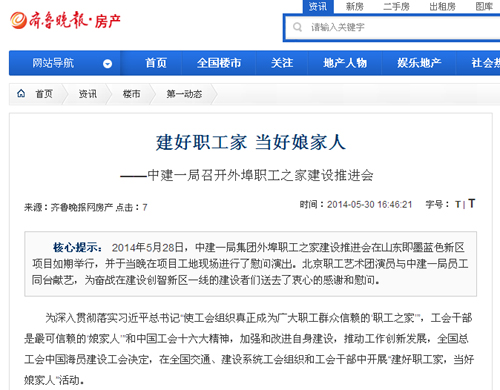 本网讯 5月30日《齐鲁晚报网》报道:建好职工家 当好娘家人——中建一局召开外埠职工之家建设推进会,全文及地址如下:http://fangchan.qlwb.com.cn/news/loushi/2014/bobao_0531/5023_all.html