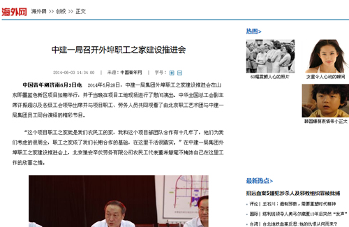 本网讯 6月3日,海外网刊发中建一局召开外埠职工之家建设推进会,全文及链接如下:http://invest.haiwainet.cn/n/2014/0603/c232660-20699966.html
