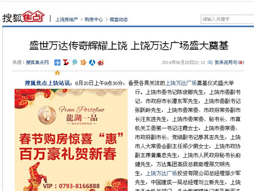 本网讯 6月20日,搜狐焦点网报道了上饶万达广场项目的奠基仪式。文章如下:http://www.focus.cn/news/shangrao-2014-06-20/5174979.html