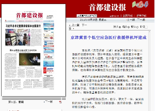 本网讯 6月25日,《首都建设报》以“京津冀首个低空应急医疗救援停机坪建成”为题,对三公司北大国际医院停机坪整体通过验收,年底投入使用进行报道,文章及地址如下:http://sdjsb.bjd.com.cn/html/2014-06/25/content_190709.htm