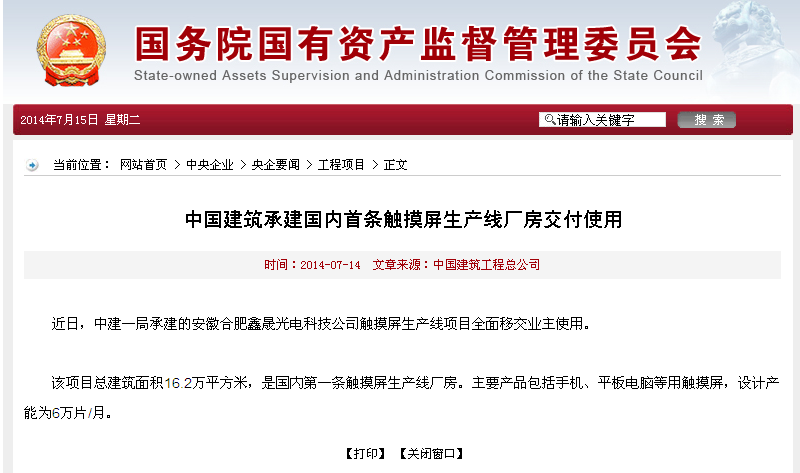 本网讯 7月15日,国资委网站发布建设发展公司承建的国内收条触摸屏生产线厂房交付使用的新闻,文章及地址如下:http://www.sasac.gov.cn/n1180/n1226/n2410/n314274/15959541.html 近日,中建一局承建的安徽合肥鑫晟光电科技公司触摸屏生产线项目全面移交业主使用。 该项目总建筑面积16.2万平方米,是国内第一条触摸屏生产线厂房。主要产品包括手机、平板电脑等用触摸屏,设计产能为6万片/月。