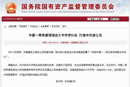 本网讯 9月18日,国务院国资委网站刊发《中建一局承建恒信远大中华梦幻谷 打造中式迪士尼》一文。文章及地址如下:http://www.sasac.gov.cn/n1180/n1226/n2410/n314304/16056291.html