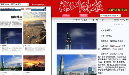 本网讯 9月29日,《深圳晚报》刊登鹏城地标的图片,第一幅《屏幕快照》为在建的平安金融中心。地址如下:http://wb.sznews.com/html/2014-09/29/content_3019582.htm