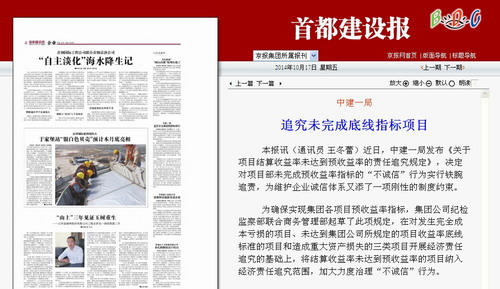 本网讯:10月17日,《首都建设报》刊载《中建一局追究未完成底线指标项目》消息,报道链接如下:http://sdjsb.bjd.com.cn/html/2014-10/17/content_224819.htm
