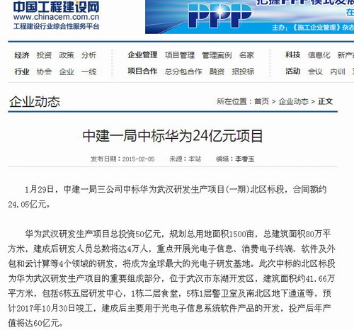 本网讯 中国工程建设网刊发中建一局中标华为24亿元项目消息。地址链接如下: