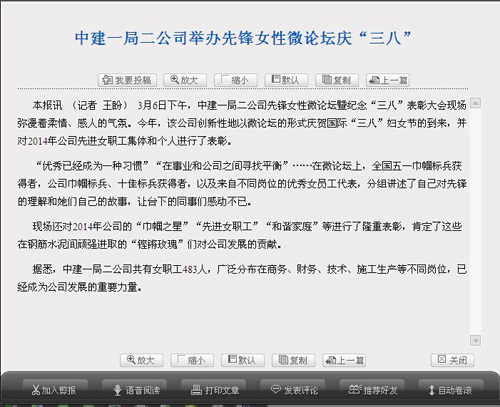 本网讯 2015年3月9日,《中华建筑报》刊发文章“中建一局二公司举办先锋女性微论坛庆‘三八’”,全文及链接地址如下:http://news.idoican.com.cn/zhjzb/html/2015-03/10/content_5369404.htm