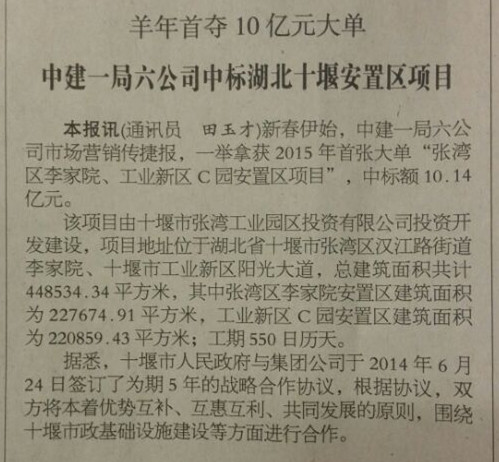 本网讯 3月16日《建筑时报》刊发《羊年首夺10亿元大单 中建一局六公司中标湖北十堰安置区项目》一文,文章内容如下: