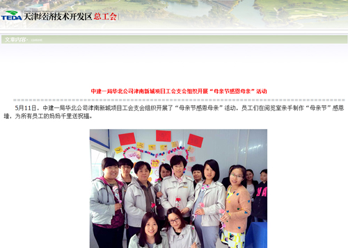 本网讯 5月13日,天津经济技术开发区总工会网站刊登了《中建一局华北公司津南新城项目工会支会组织开展“母亲节感恩母亲”活动》,全文链接及文章内容如下:http://www.teda.gov.cn/html/kfqgh/JCZS12342/2015-05-13/Detail_611096.htm