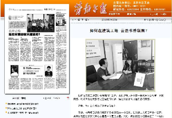 5月28日,《劳动午报》刊登了如何在建筑工地 营造书香氛围?一文,文章内容及链接如下:http://ldwb.workerbj.cn/content/2015-05/28/content_13395.htm