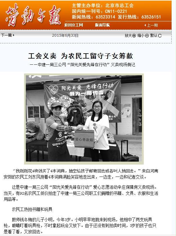 本网讯(通讯员 易三轩) 6月30日,《劳动午报》刊登了《工会义卖 为农民工留守子女筹款——中建一局三公司“阳光关爱先锋在行动”义卖现场侧记》一文,对三公司开展义卖活动为农民工留守子女筹款进行了报道。链接地址及内容如下:http://ldwb.workerbj.cn/content/2015-06/30/content_15086.htm。