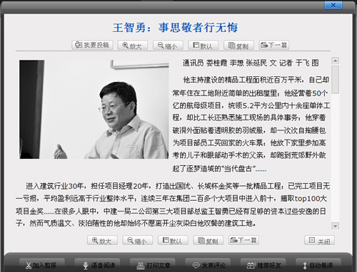 提起王智勇,已经搭档近十年的第三大大项目部书记张延民话语中流露出由衷的钦佩。“智勇经理挑的是相当于分公司一把手的担子,但他比总工还熟悉图纸,比工长还熟悉现场,凡事亲力亲为的敬业态度让跟他共事过的人都打心眼儿里佩服。”