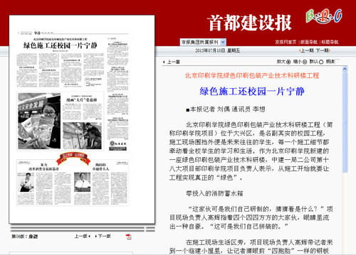 本网讯 《首都建设报》7月10日刊发通讯文章“绿色施工还校园一篇宁静”报道二公司北京印刷学院项目绿色施工纪实,全文及链接地址如下:http://sdjsb.bjd.com.cn/html/2015-07/10/content_293901.htm