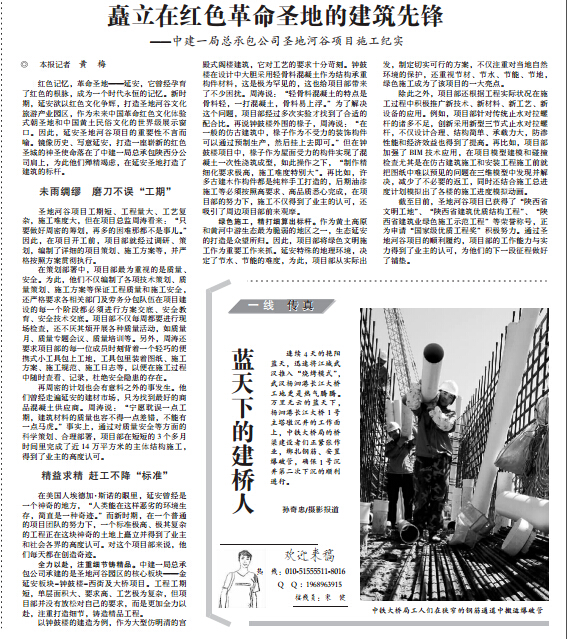 本网讯 《中国建设报》8月14日刊《矗立在红色革命圣地的建筑先锋——中建一局总承包公司圣地河谷项目施工纪实》,报道总承包公司延安圣地河谷项目施工纪实情况,全文及链接地址如下:http://www.chinajsb.cn/bz/content/2015-08/14/content_167830.htm