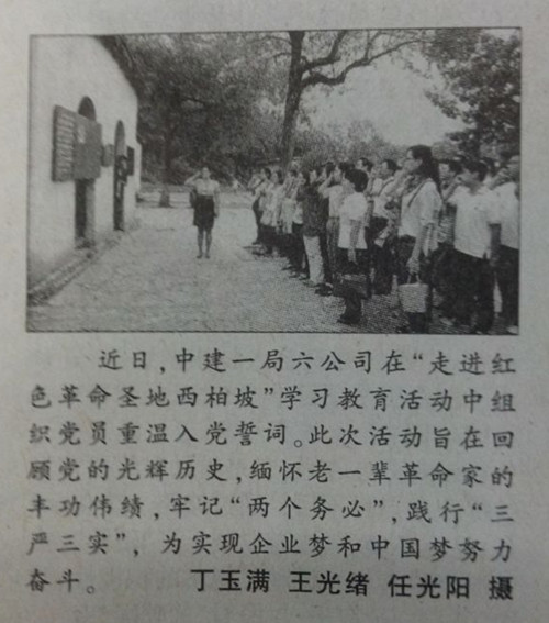 本网讯 9月7日,《河北经济日报》对六公司组织开展走进革命圣地西柏坡学习教育活动进行了图文报道,具体内容如下: 近日,中建一局六公司在“走进红色革命圣地西柏坡”学习教育活动中组织党员重温入党誓词。此次活动旨在回顾党的光辉历史,缅怀老一辈革命家的丰功伟绩,牢记“两个务必”,践行“三严三实”,为实现企业梦和中国梦努力。