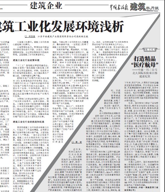 本网讯 12月29日,《中国建设报》刊登《打造精品“医疗航母”》一文,对三公司北大国际医院项目建设进行了报道,原文如下: