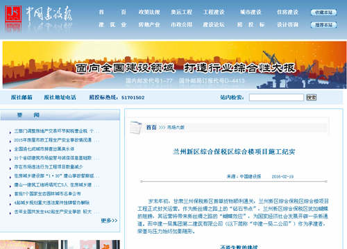 本网讯 2月19日,《中国建设报》刊发中建一局二公司兰州新区综合保税区综合楼项目施工纪实《在丝绸之路上翩然起舞》,全文及链接地址如下:http://www.chinajsb.cn/bz/content/2016-02/19/content_183014.htm