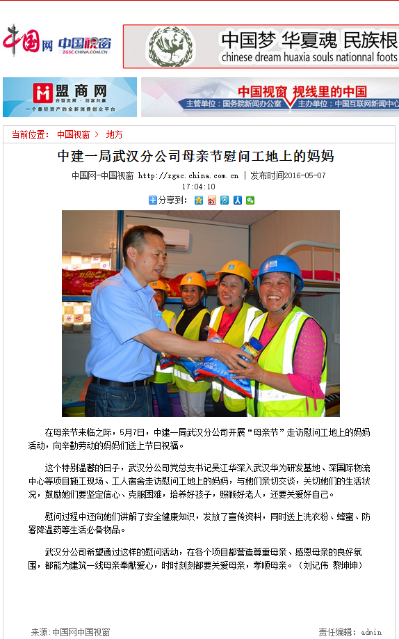 本网讯 5月7日,中国网、搜狐网、先锋资讯网报道《中建一局武汉分公司母亲节慰问工地上的妈妈》一文,对中建一局武汉分公司母亲节慰问工地上的妈妈进行了报道,链接地址及原文如下: