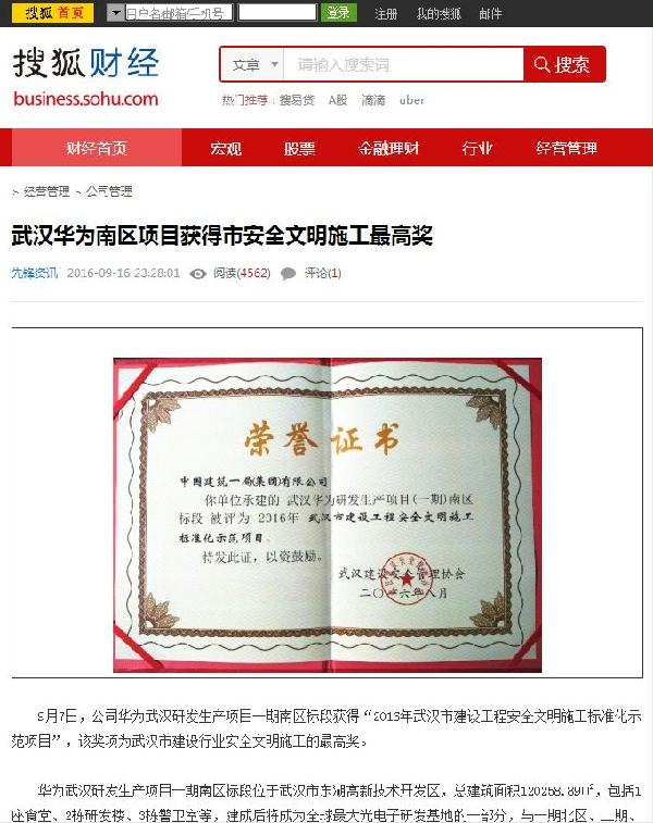 本网讯 9月17日,搜狐财经网刊登《武汉华为南区项目获得市安全文明施工最高奖》一文,对中建一局三公司武汉华为南区项目获得 “2016年武汉市建设工程安全文明施工标准化示范项目”进行了报道,链接地址及原文如下: