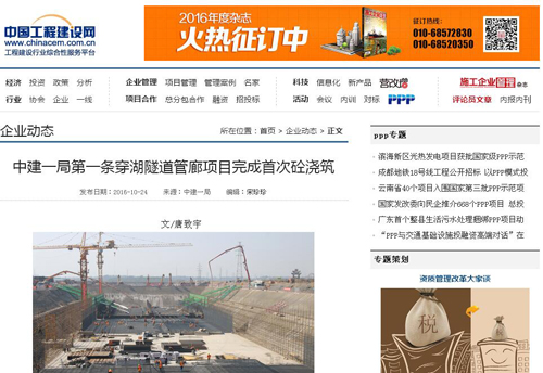 本网讯 中国工程建网10月24日刊发消息《中建一局第一条穿湖隧道管廊项目完成首次砼浇筑》全文及链接地址如下:http://www.chinacem.com.cn/qydt/2016-10/216187.html