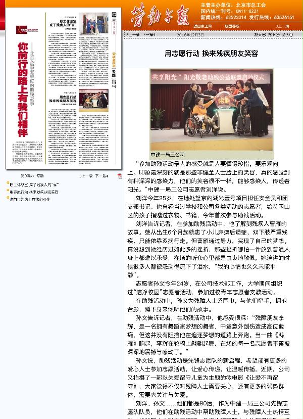 本网讯 11月30日,《劳动午报》刊登《中建一局三公司用志愿活动换来残疾朋友笑容》一文,对中建一局三公司开展助残志愿活动进行了专题报道,链接地址及原文如下:http://ldwb.workerbj.cn/content/2016-12/03/content_41524.htm