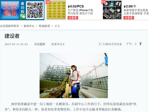 本网讯 1月11日,《北京晨报》刊发图片版新闻纪实“建设者”,记录中建一局北京城市副中心项目建设。原文及链接地址如下: