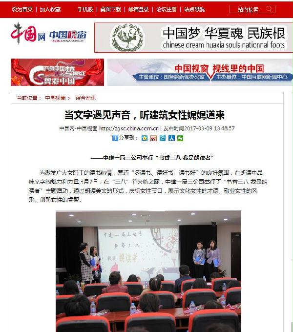 本网讯 3月8日,中国网、中工网刊发消息《当文字遇见声音,听建筑女性娓娓道来》,对中建一局三公司举行“书香三八我是朗读者”活动进行了报道,链接地址及原文如下: