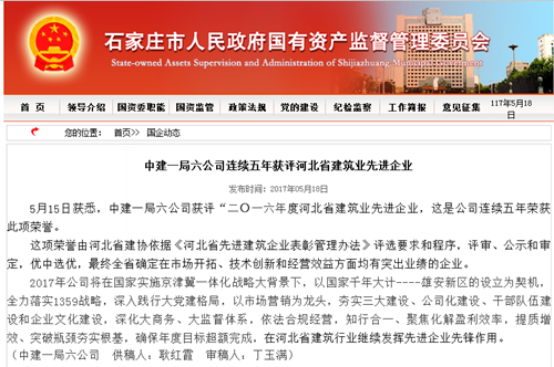 本网讯 5月18日,石家庄市国资委网站刊发消息《中建一局六公司连续五年获评河北省建筑业先进企业》,文章内容及链接如下:http://www.sjzgz.gov.cn/col/1308108434269/2017/05/18/1495069982151.html