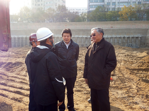 在视察中,胡启立同志兴致勃勃地来到施工现场,下到基坑与正在紧张施工作业的工人热情地握手,并向项目部人员了解工程进展、阶段性成果、安全质量保障措施等情况。项目书记王惠友向胡启立同志、齐鸣秋常务副主席表示中建一局作为建筑行业的国家队有能力、有信心、有决心将基金会项目工程建设成为高品质、高质量的精品工程,作为中央企业建设好这个项目工程也是应尽的社会责任。