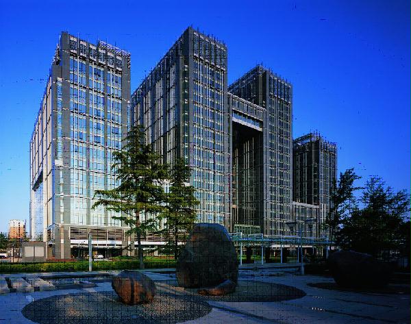 工程说明:国际投资大厦位于北京市两大主力商圈-金融街商圈和中关村商圈之间,由四栋楼体既相互独立又通过裙楼联为一体的高层写字楼组成,地下3层,地上主体由南向北分为A、B、C、D栋,其中A、D栋15层,檐口高度63.70m;B、C栋20层,檐口高度83.10m,局部18层,裙房6层。A、B、C、D栋楼六层以下连成整体,地下部分均为车库、物业用房、员工餐厅及机电用房;地上部分1-2层为餐厅、会议室等,3层以上均为办公用房。四栋楼均设独立出入口,既可共享大厦整体资源,又可独立办公。该工程地基为天然地基,A、B、C、D栋主楼基础型式为满堂筏板基础,裙房采用独立柱基,挡土外墙为条形基础;结构形式为钢筋混凝土框架剪力墙结构。外立面为干挂石材、玻璃幕墙、金属幕墙,立面造型简洁、庄重,在形体上为严格的几何对称。
