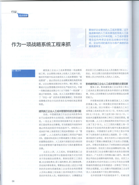 本网讯 《施工企业管理》杂志2014年第3期刊发建设发展公司关于建筑施工企业人工成本管理的文章《作为一项战略系统工程来抓》,全文如下: