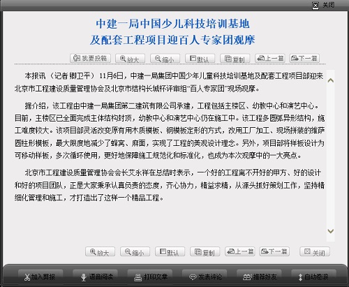 本网讯 《中华建筑报》刊发文章“中建一局中国少年科技培训基地及配套工程项目迎百人专家团观摩”全文及链接地址如下:http://news.idoican.com.cn/zhjzb/html/2014-11/14/content_5300070.htm