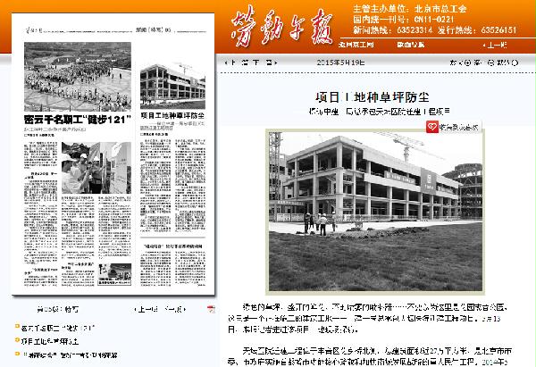 5月19日,劳动午报刊登了《项目工地种草坪防尘 ——探访中建一局总承包天坛医院迁建工程项目》一文,文章内容及链接如下:http://ldwb.workerbj.cn/content/2015-05/19/content_12796.htm
