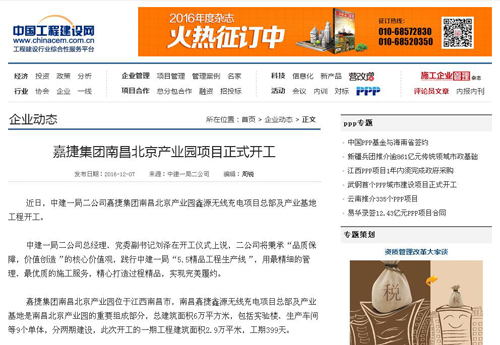 本网讯 12月7日,“中国工程建设网”刊发消息:嘉捷集团南昌北京产业园项目正式开工,全文及链接地址如下:http://www.chinacem.com.cn/qydt/2016-12/217074.html