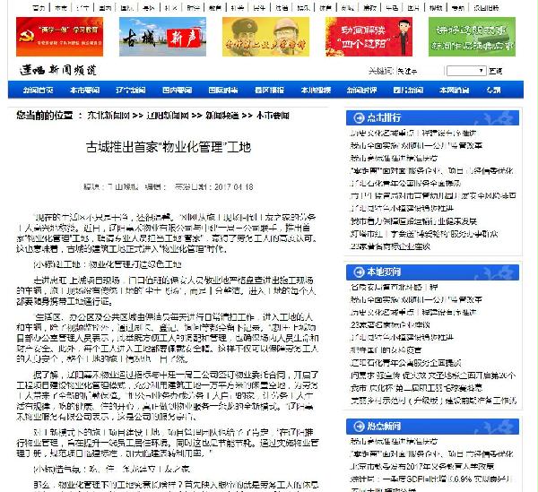 本网讯 4月18日,东北新闻网、《千山晚报》刊发《古城推出“物业化管理”工地》,对中建一局三公司辽宁忠旺·上城项目物业化管理进行了报道,链接地址及原文如下: